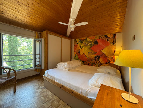 "Yellow" bedroom with closet and a large double bed (180/200) equipped with a ceiling fan. The bedroom window is equipped with a mosquito net and an electric shutter. It opens onto the terrace with the pergola and a view of the swimming pool.